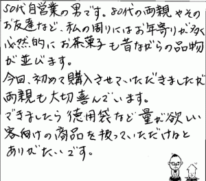 お客様の声 サクサク昆布へのご感想を頂きました。 2013.05.28 サクサク昆布についてのご感想 半生ソフトドライマンゴーへのご感想を頂きました。 2013.05.28 半生ソフトドライマンゴーについてのご感想 純国産鮭とばのご感想を頂きました。 2013.05.28 鮭とばについてのご感想 国産カリカリ梅ポットへのご感想を頂きました。 2013.05.28 カリカリ梅ポットについてのご感想 国産無添加素干足ポットへのご感想を頂きました。 2013.05.28 素干足ポットについてのご感想 うるめいわしへのご感想を頂きました。 2013.05.28 焼きうるめピロ125gについてのご感想 国産無添加あたりめとするめ足のセットへのご感想を頂きました。 2013.05.28 するめ足とあたりめセットへのご感想 国産無添加あたりめとするめ足のセットへのご感想を頂きました。 2013.05.28 するめ足とあたりめセットへのご感想 訳あり函館こがねの切れっ端へのご感想を頂きました。 2013.05.28 訳あり函館こがねの切れっ端についてのご感想 訳あり甘のしいかの切れっ端いかあられへのご感想を頂きました。 2013.05.28 いかあられの切れっ端についてのご感想 ドライフルーツバスケットのご感想を頂きました。 2013.05.28 ドライフルーツバスケットについてのご感想 さきいかの天ぷらのご感想を頂きました。 2013.05.28 さきいか天ぷらについてのご感想 しそ茎わかめのご感想を頂きました。 2013.05.28 しそ茎わかめについてのご感想 訳ありいかあられ切れっ端へのご感想を頂きました。 2013.05.28 いかあられの切れっ端についてのご感想 素焼あたりめへのご感想を頂きました。 2013.05.28 あたりめ 素焼あたりめへのご感想を頂きました。 2013.05.28 あたりめ 素焼アーモンドへのご感想を頂きました。 2013.05.28 素焼アーモンドについてのご感想 ドライブルーベリーへのご感想を頂きました。 2013.05.28 ドライブルーベリー 甘のしいかいかあられの切れっ端へのご感想を頂きました。 2013.05.28 いかあられの切れっ端についてのご感想 スマートするめダブルセット(するめ足とあたりめ)へのご感想を ... 2013.05.28 スマートするめとスマートあたりめのセットについてのご感想 ココナッツチップスのご感想を頂きました。 2013.05.28 ココナッツチップスについてのご感想 46 / 47«...10203040...454647